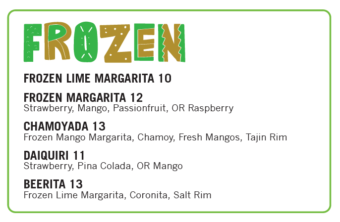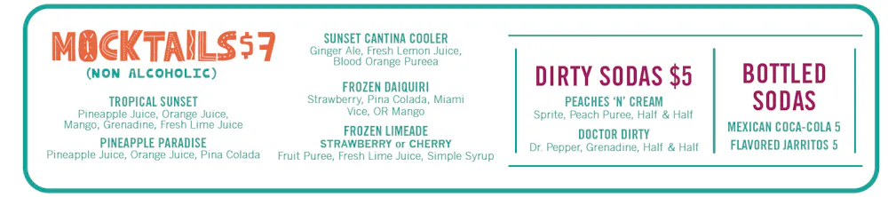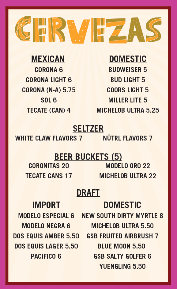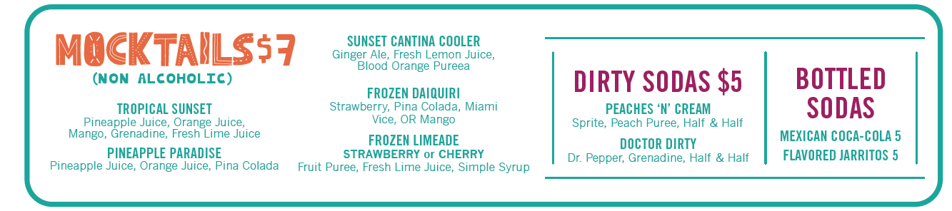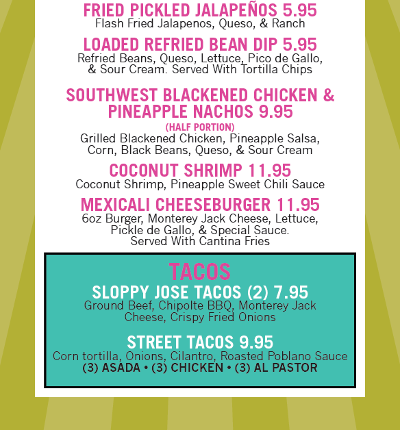 BLACK BEANS 4.25 REFRIED BEANS 4.25 MEXICAN RICE 4.25 BLACK BEANS & MEXICAN RICE 5.25 STREET CORN 5.50 CANTINA FRIES 5.25 SIDE SALAD 6.95